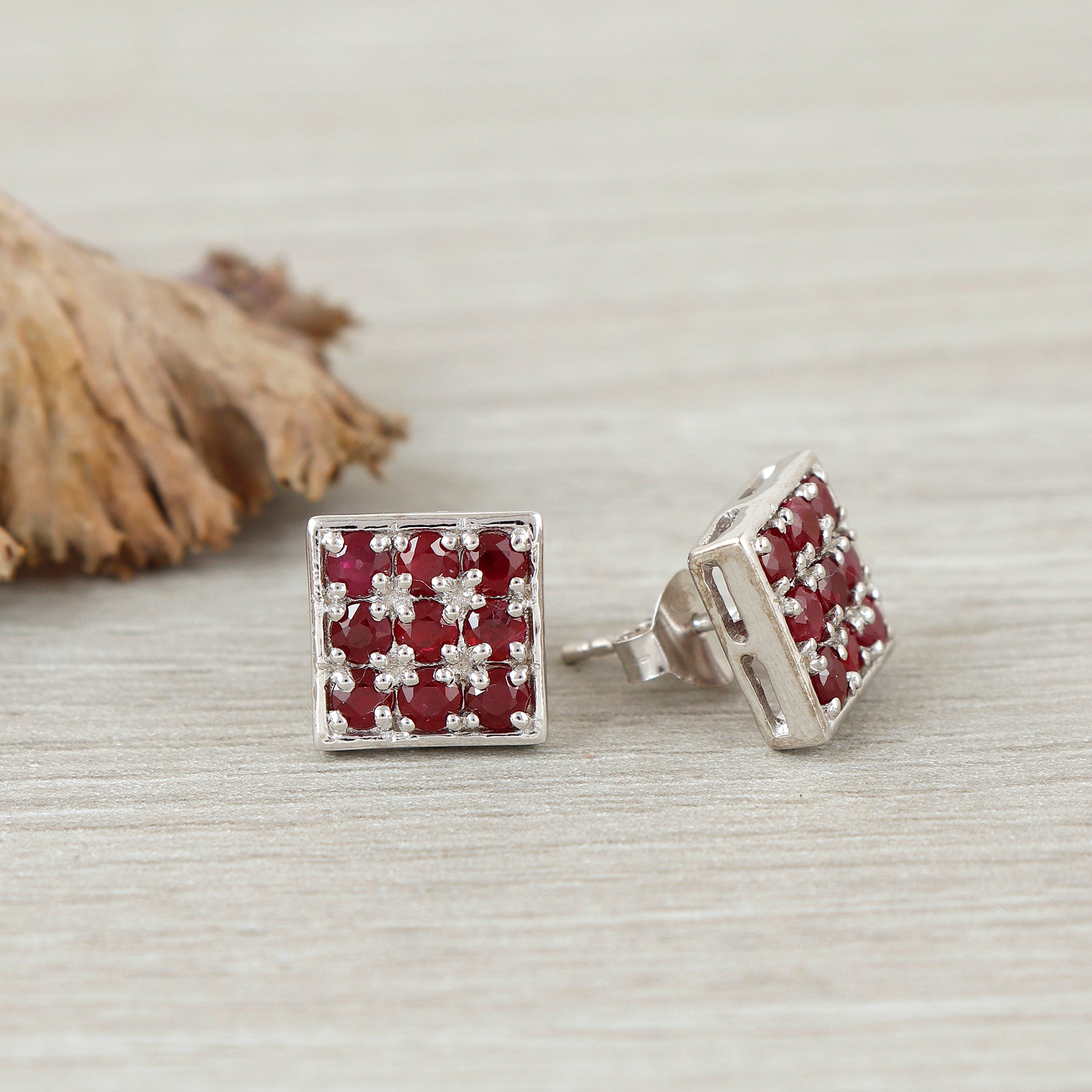 Ruby Stud Earrings-July Birthstone Stud Earrings-925 Sterling Silver-Square Ruby Studs-Round Cut Gemstone Earrings-Dainty Earrings for Gift